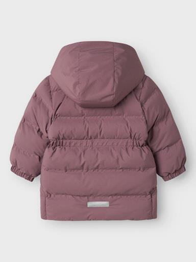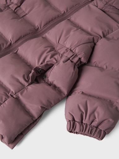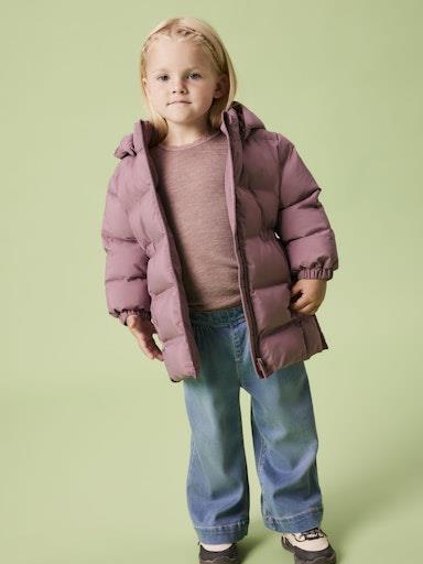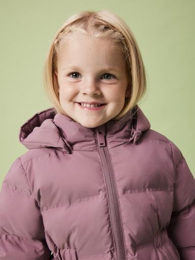 Otroška dekliška zimska jakna prešitega videza, z visokim ovratnikom in odstranljivo kapuco, z mehko in toplo podlogo iz flisa, podložena je tudi kapuca, z dvema žepoma na straneh, z elastiko v pasu, z odsevnim elementom zadaj, zapenjanje z zadrgo spredaj, rahlo daljši kroj. Material: zunaj: 100% recikliran poliester; podloga: 100% poliester; polnilo: 100% recikliran poliester