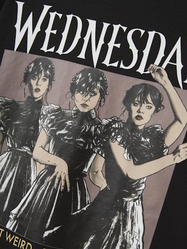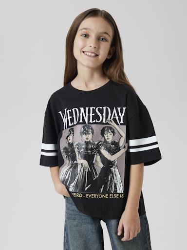Otroška dekliška majica s kul licenčnim potiskom junakinje iz serije Wednesday, z dekorativnimi črtami na rokavih, širši in krajši kroj, kratek rokav. Material: 95% bombaž, 5% elastan