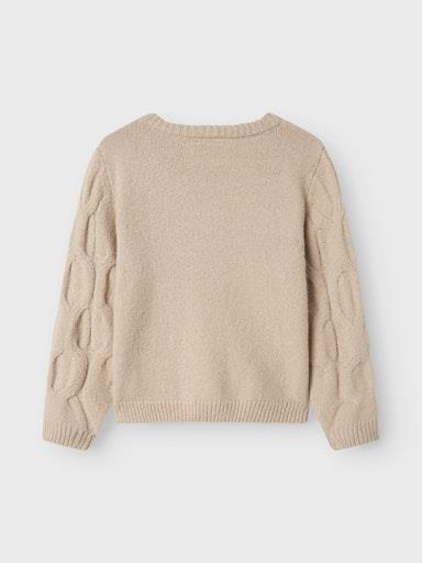 Otroški dekliški moden pulover iz fine in mehke pletenine, z dekorativnimi pentljami, z all over vzorcem v pletenini, z rebrastimi zaključki, regular kroj, dolg rokav. Material: 50% recikliran poliester, 29% poliester, 17% poliamid, 4% elastan