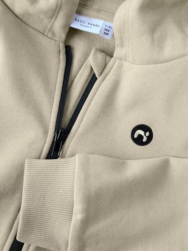 Otroška fantovska basic jopa s kapuco, zapenjanje na zadrgo, s potiskom spredaj, z dvema žepoma, s patentom na zaključkih, kosmaten material, dolg rokav. Material: 60% ekološki bombaž, 40% recikliran poliester