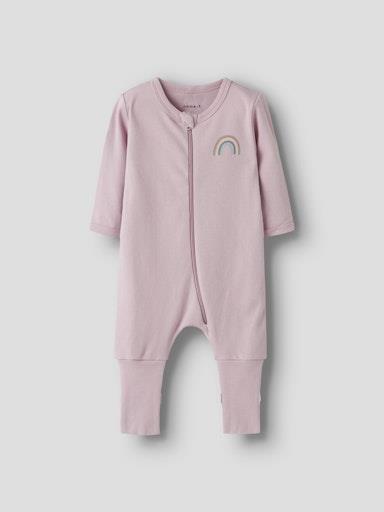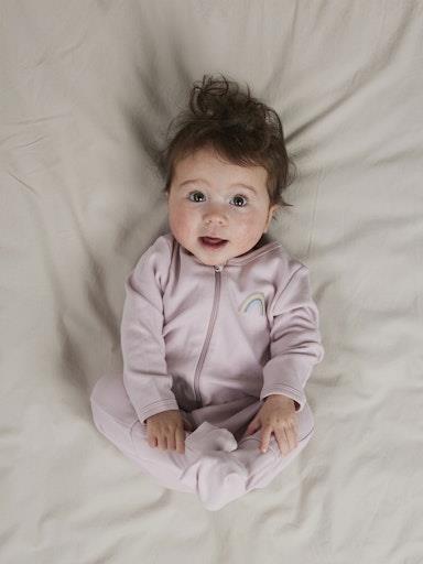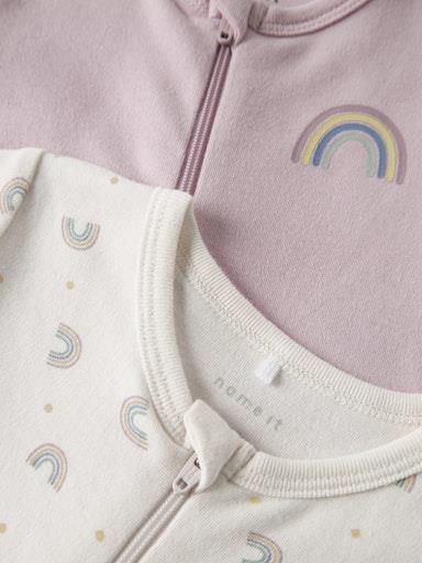 Otroška pižama za dekleta - pajac brez stopalk, z zavihkom na hlačnicah za pokrivanje stopal, zapenjanje na zadrgo. 2 kosa v pakiranju. V lični embalaži. Material: 51% ekološki bombaž, 49% bombaž; 14,99€/kos