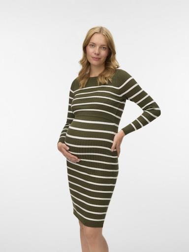 Nosečniška modna in udobna obleka iz prijetnega rebrastega materiala, z all over črtastim vzorcem, z dodanim notranjim delom za lažje dojenje, prilagodljiv kroj za rastoč trebušček, dolžina do kolen, dolg rokav. Material: 70% LENZING™ ECOVERO™ viskoza, 30% najlon