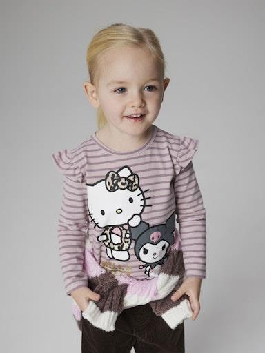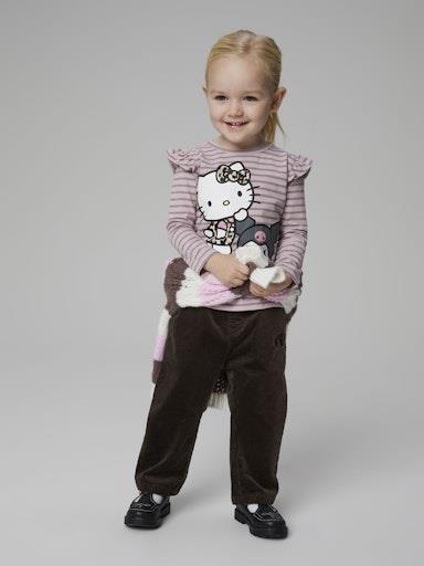 Otroška dekliška majica s pikupnim licenčnim potiskom Hello Kitty, s potiskom spredaj in all over vzorcem, z bleščicami, z volančki na ramenih, regular kroj, dolg rokav. Material: 95% bombaž, 5% elastan