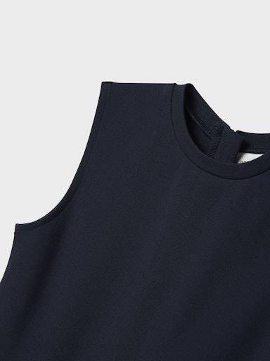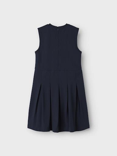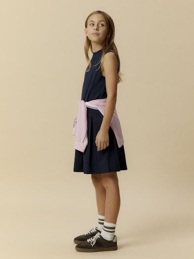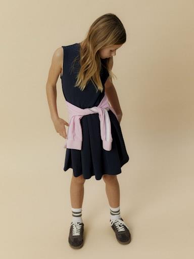Otroška dekliška modna obleka iz prijetne in udobne viskoze, z elastiko v pasu, z nabranim spodnjim delom, zapenjanje z zadrgo zadaj, regular kroj, brez rokavov. Material: 63% LENZING™ ECOVERO™ viskoza, 32% najlon, 5% elastan