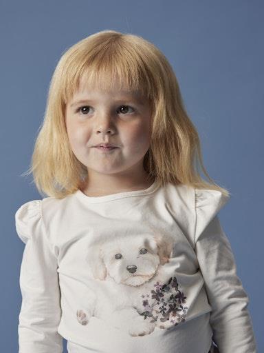 Otroška dekliška majica iz prijetnega in udobnega bombaža, s prikupnim potiskom spredaj, rahlo nabrana na ramenih, regular kroj, dolg rokav. Material: 95% ekološki bombaž, 5% elastan