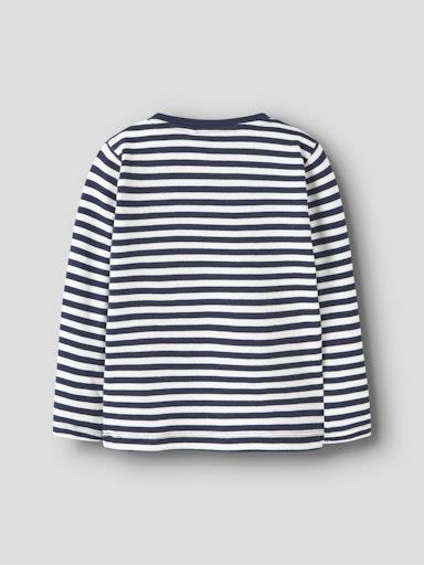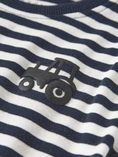 Otroška fantovska majica z all over črtastim vzorcem, s potiskom spredaj, slim kroj, dolg rokav. Material: 100% bombaž