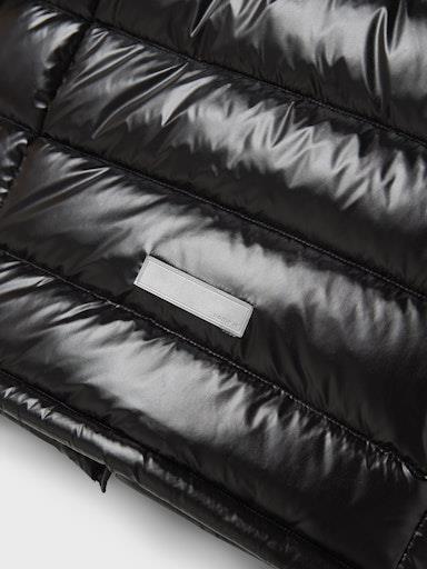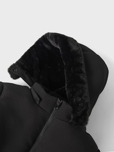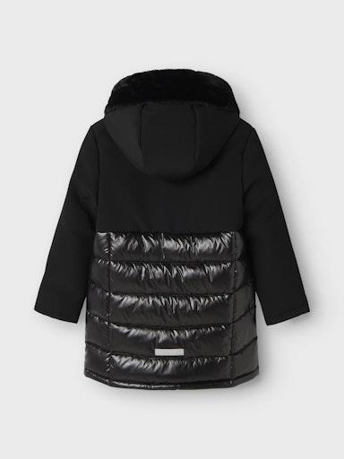 Otroška dekliška daljša zimska jakna v modni kombinaciji gladkega, svetlečega materiala spodaj in pletenega materiala zgoraj, z toplo podloženo odstranljivo kapuco, z umetnim krznom v kapuci, z dvema žepoma spredaj, spodnji del je prešitega videza, z odsevnim elementom zadaj, zapenjanje z zadrgo. Material: zunaj: 50% najlon, 50% poliester; podloga: 100% poliester; polnilo: 100% recikliran poliester