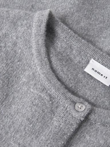 Otroška dekliška modna jopa iz fine in izjemno mehke pletenine, z rebrastimi zaključki, z dekorativnimi gumbi spredaj, rahlo krajši kroj, dolg rokav. Material: 50% recikliran poliester, 29% poliester, 17% poliamid, 4% elastan