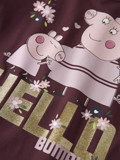 Otroška dekliška majica s prikupnim licenčnim potiskom priljubljene Pujse Pepe, z bleščičastimi detajli, rahlo nabrana na ramenih, rahlo širši in krajši kroj, dolg rokav. Material: 95% ekološki bombaž, 5% elastan