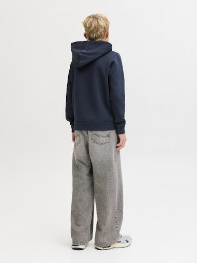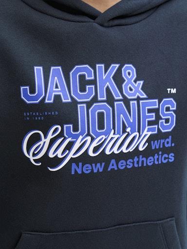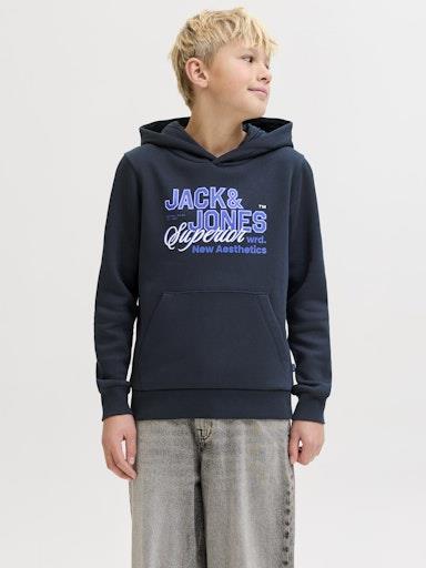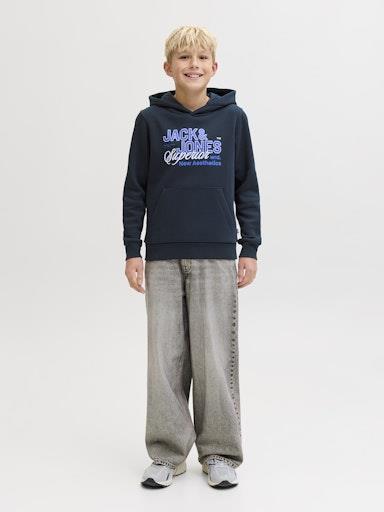 Otroški fantovski moden in udoben pulover s kapuco blagovne znamke JACK & JONES JUNIOR, kosmaten material, z logotiopm spredaj, s patentom na zaključkih, "kenguru" žep spredaj, dolg rokav. Material: 50% ekološki bombaž, 30% recikliran poliester, 20% bombaž