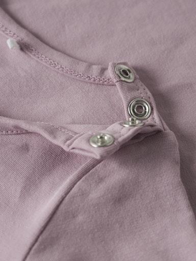 Otroški dekliški body z mehkim potiskom spredaj, rahlo nabran na ramenih, zapenjanje na rami s skritimi pritiskači, dolg rokav. Material: 95% ekološki bombaž, 5% elastan