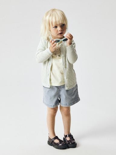 Otroške dekliške udobne jeans kratke hlače, rahlo spranega videza, z elastiko in pentljico v pasu, 2 žepa spredaj, nastavljiva širina pasu. Material: 71% TENCEL™ liocel, 20% recikliran poliester, 8% viskoza, 1% elastan
