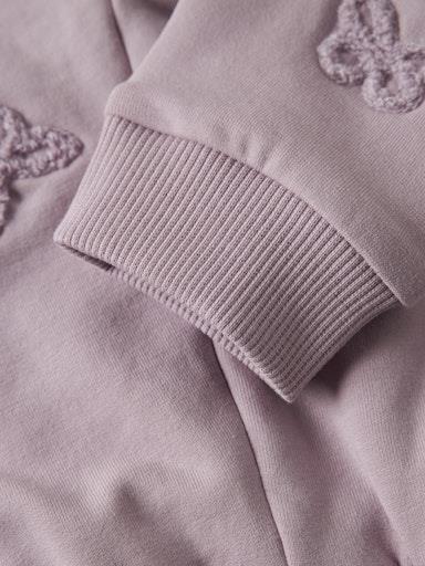Otroške dekliške hlače iz prijetnega ekološkega bombaža, z izvezenim vzorcem spredaj, s širokim in mehkim patentom na zaključkih, kosmaten material, regular kroj. Material: 95% ekološki bombaž, 5% elastan