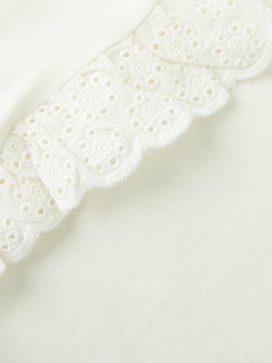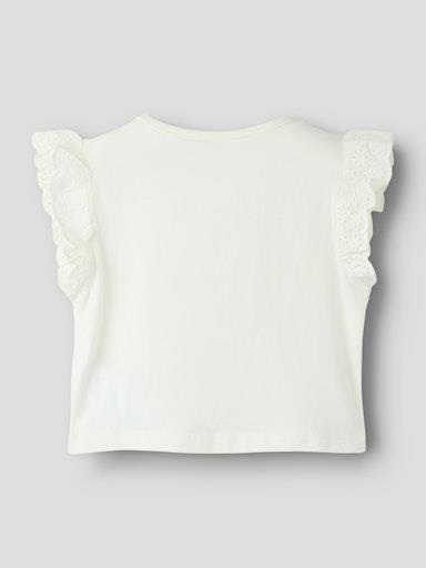 Otroška dekliška modna majica iz prijetnega ekološkega bombaža, z luknjičastim vzorcem in volančki na rokavih, rahlo širši kroj, kratek roakv. Material: 100% ekološki bombaž