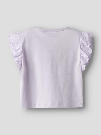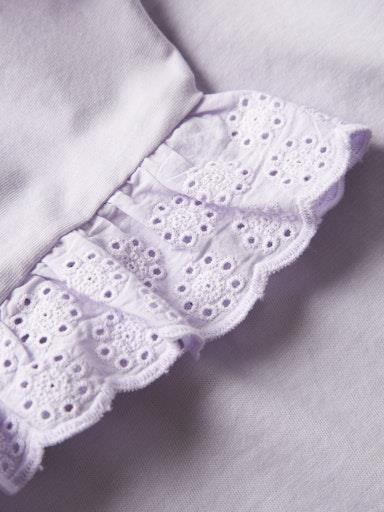Otroška dekliška modna majica iz prijetnega ekološkega bombaža, z luknjičastim vzorcem in volančki na rokavih, rahlo širši kroj, kratek roakv. Material: 100% ekološki bombaž
