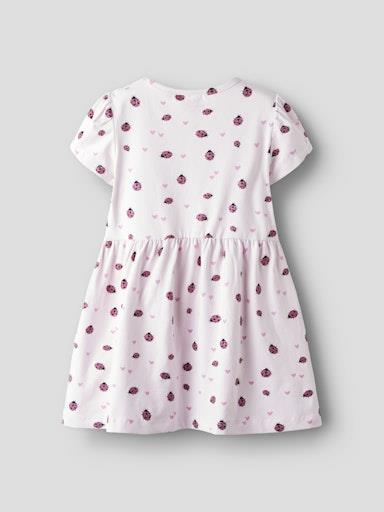 Otroška dekliška obleka iz prijetnega ekološkega bombaža, z all over potiskom, z elastiko v pasu, regular kroj, kratek rokav. Material: 95% ekološki bombaž, 5% elastan