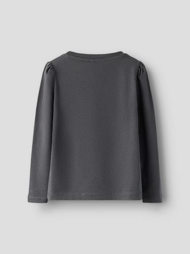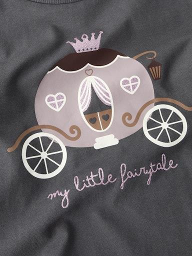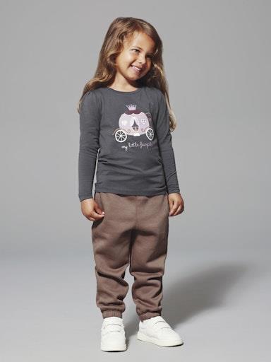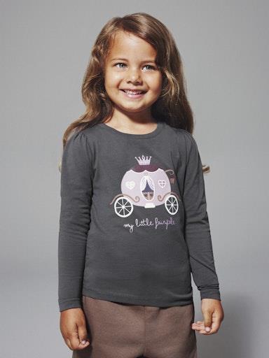 Otroška dekliška majica iz prijetenga ekološkega bombaža, s potiskom spredaj, z bleščičastimi detajli, rahlo nabrana na ramenih, regular kroj, dolg rokav. Material: 95% ekološki bombaž, 5% elastan