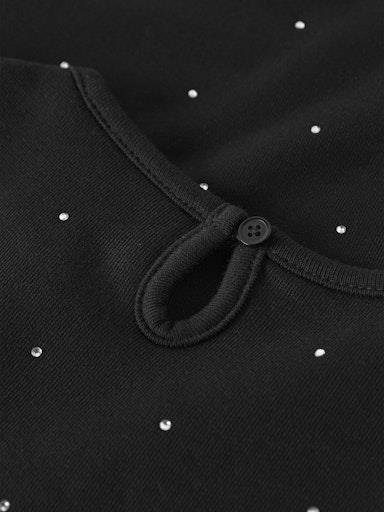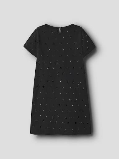 Otroška dekliška modna obleka iz prijetnega ekološkega bombaža, z all over dekorativnimi kamenčki, udoben A-kroj, zapenjanje z gumbom zadaj, dolžina do kolen, kosmaten material, kratkek rokav. Material: 100% ekološki bombaž