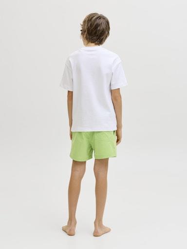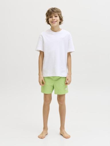Otroške fantovske kopalne kratke hlače blagovne znamke JACK & JONES JUNIOR, z vrvico in elastiko v pasu, z napisom na hlačnici, z mehkimi mrežastimi notranjimi hlačami, hitro sušeč material. Nastavljiva širina pasu. Material: 100% recikliran poliester