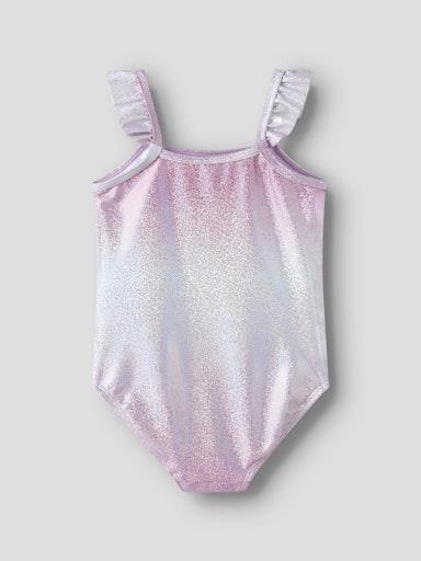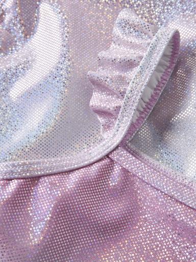 Otroške dekliške enodelne kopalke, s svetlikajočimi detajli, z volančki na ramenih. Material: 82% recikliran poliester, 18% elastan