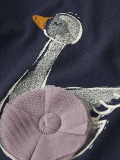 Otroška dekliška majica iz prijetnega ekološkega bombaža, s potiskom spredaj in s 3D našitkom, z rahlo nabranimi rameni, regular kroj, dolg rokav. Material: 75% ekološki bombaž, 20% recikliran bombaž, 5% elastan