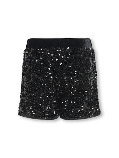 Otroške dekliške modne in elegantne kratke hlače blagovne znamke KIDS ONLY, z našitimi dekorativnimi bleščicami, z elastiko v pasu, nastavljiva širina pasu, regular kroj. Material: 50% recikliran poliester, 45% poliester, 5% elastan