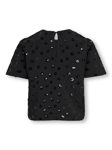 Otroška dekliška modna in elegantna bluza blagovne znamke KIDS ONLY, z našitimi dekorativnimi bleščicami, zapenjanje z gumbom zadaj, rahlo širši in krajši kroj, kratek rokav. Material: 95% poliester, 5% elastan