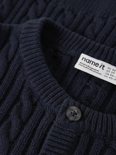 Otroška fantovska elegantna pletena jopa, iz mehkega ekološkega bombaža z vzorcem, z rebrastim patentom na zaključkih, z dekorativnim našitkom spredaj, zapenjanje z gumbi spredaj, regular kroj, dolg rokav. Material: 100% ekološki bombaž