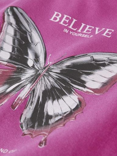 Otroški dekliški pulover s kapuco iz prijetnega ekološkega bombaža, s potiskom spredaj in zadaj, z mehkim rebrastim patentom na zaključkih, nekosmaten material, krajši in širši kroj, dolg rokav. Material: 80% ekološki bombaž, 20% bombaž