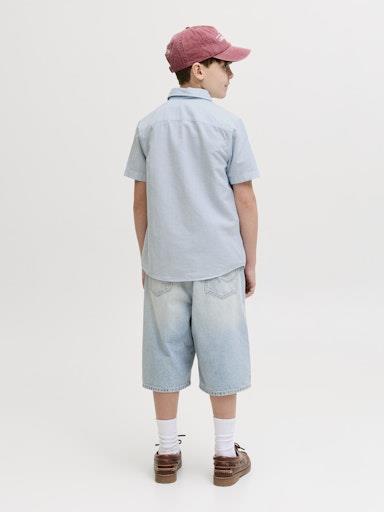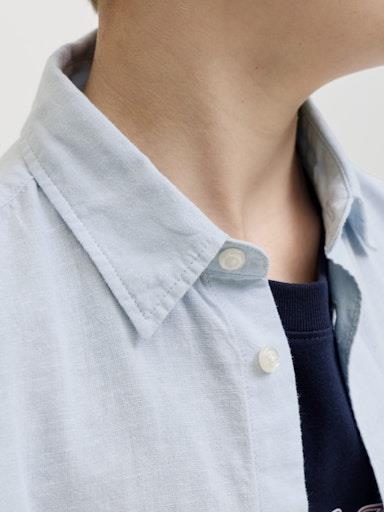 Otroška modna fantovska srajca blagovne znamke JACK&JONES s klasičnim ovratnikom, iz prijetne in lahke kombinacije bombaža in lana, zapenjanje na gumbe, prijeten in mehak material, regular kroj, kratek rokav. Material: 70% bombaž, 30% lan