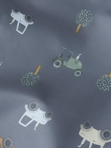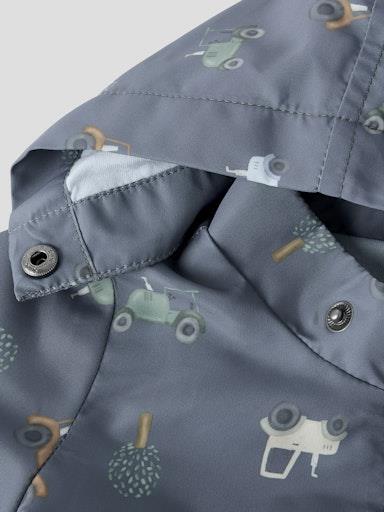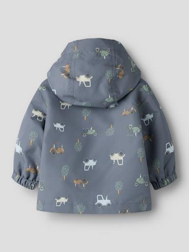 Deloma vodonepropustna fantovska prehodna jakna za pomlad/poletje s prikupnim all over vzorcem in mehko podlogo, z visokim ovratnikom, odstranljivo kapuco, s patentom na zapestjih, zapenjane na zadrgo, z dvema nakazanima žepoma spredaj. Material: 100% recikliran poliester; podloga: 65% poliester, 35% bombaž
