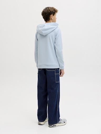 Otroški fantovski nekosmaten pulover s kapuco blagovne znamke JACK & JONES JUNIOR, s kenguru žepom spredajj, s patentom na zaključkih, kosmaten material, dolg rokav. Material: 61% poliester, 39% bombaž