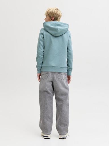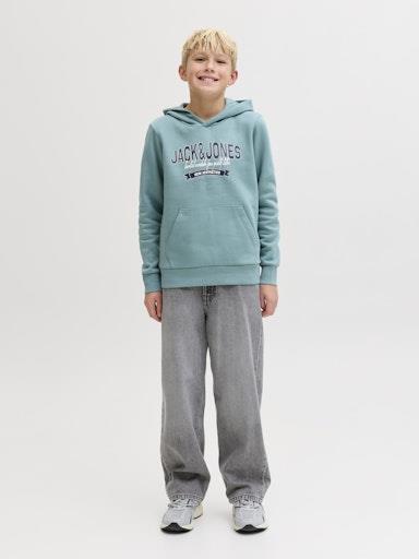 Otroški fantovski moden in udoben pulover s kapuco blagovne znamke JACK & JONES JUNIOR, kosmaten material, z logotiopm spredaj, s patentom na zaključkih, "kenguru" žep spredaj, dolg rokav. Material: 50% ekološki bombaž, 30% recikliran poliester, 20% bombaž
