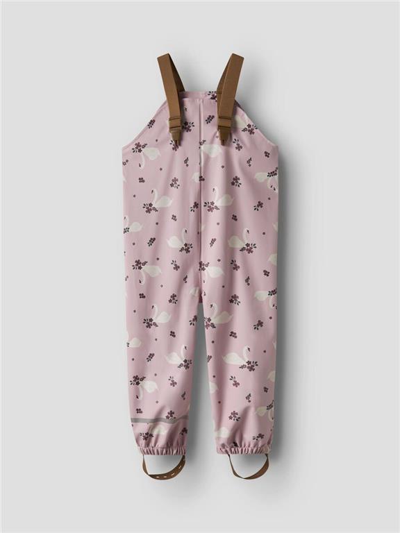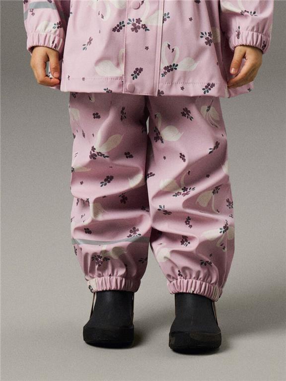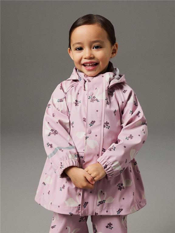 Otroški dekliški dežni komplet z all over prikupnim potiskom, z visokim vodnim stolpcem (10.000mm), ne prepušča vetra, z lepljenimi šivi, primeren za igro in sprehode v dežju. Sestavljen iz jakne z odstranljivo kapuco, z odsevniki na rokavu, 2 žepa na straneh, zapenjanje na zadrgo in nete, ter hlač z naramnicami (hlače z aramnicami pri vseh velikostih), z odsevnikom na hlačnici, s prilagodljivima in odstranljivima elastičnima trakovoma na dnu hlačnic. Material: 100% poliester - poliuretan