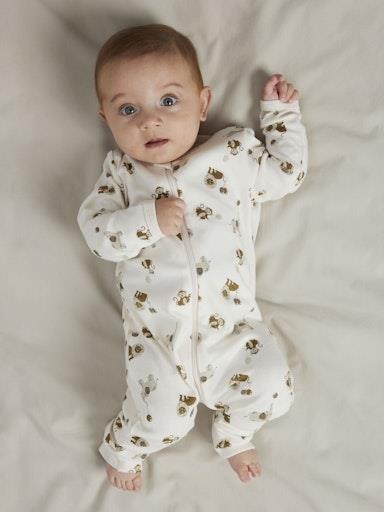 Otroška unisex pižama - pajac brez stopalk, z zavihkom na hlačnicah za pokrivanje stopal, zapenjanje na zadrgo. 2 kosa v pakiranju. V lični embalaži. Material: 51% ekološki bobaž, 49% bombaž; 14,99€/kos