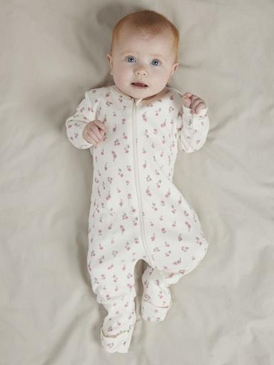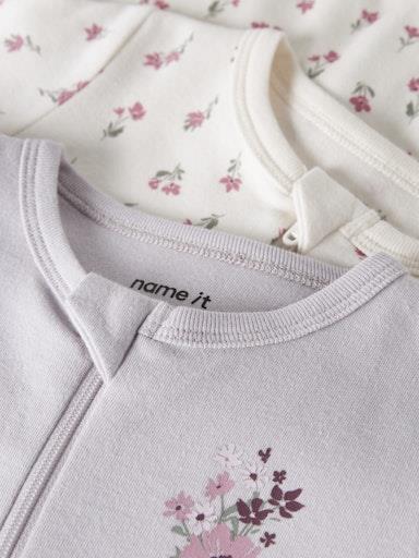Otroška pižama za dekleta - pajac brez stopalk, z zavihkom na hlačnicah za pokrivanje stopal, zapenjanje na zadrgo. 2 kosa v pakiranju. V lični embalaži. Material: 51% ekološki bombaž, 49% bombaž; 14,99€/kos