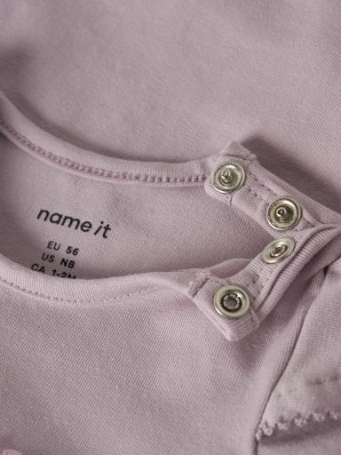 Otroški dekliški body z mehkim potiskom spredaj, z volančki na ramenih, s 3D detajlom spredaj, zapenjanje na rami s skritimi pritiskači, dolg rokav. Material: 95% ekološki bombaž, 5% elastan