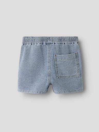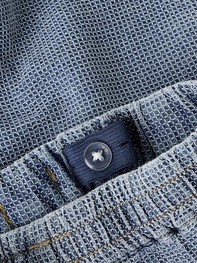 Otroške fantovske modne kratke hlače v videzu jeansa, iz prijetnega strukturiranega (vafelj) materiala, z elastiko in vrvico v pasu, z dvema žepoma spredaj in enim žepom zadaj, spranega videza, nastavljiva širina pasu, regular kroj. Material: 80% bombaž, 20% recikliran bombaž