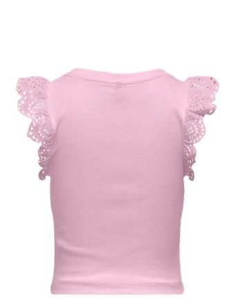 Otroška dekliška modna majica blagovne znamke KIDS ONLY, iz prijetnega rebrastega materiala, z volančki na rokavih, z luknjičastim vzorcem, oprijet kroj, kratek rokav. Material: 95% bombaž, 5% elastan