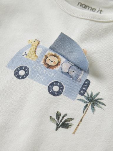 Otroška fantovska majica iz prijetnega ekološkega bombaža, s potiskom spredaj, zapenjanje na rami s skritimi pritiskači, regular kroj, dolg rokav. Material: 95% ekološki bombaž, 5% elastan