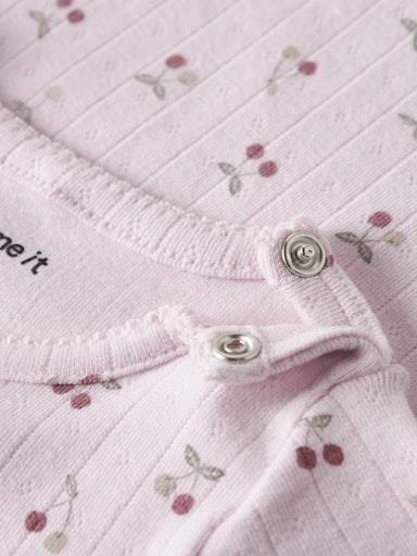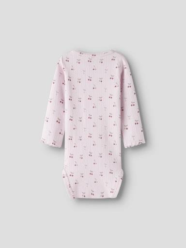 Otroški dekliški body z all over potiskom, iz prijentega strukturiranega bombaža, z valovitim zaključki na rokavih, zapenjanje na rami s skritimi pritiskači, dolg rokav. Material: 95% ekološki bombaž, 5% elastan