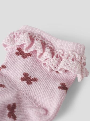 Otroške dekliške mehke nogavičke, z volančki na zgornjem robu, z all over vzorcem. Material: 77% ekološki bombaž, 20% poliamid, 3% elastan