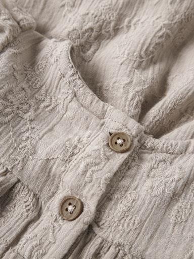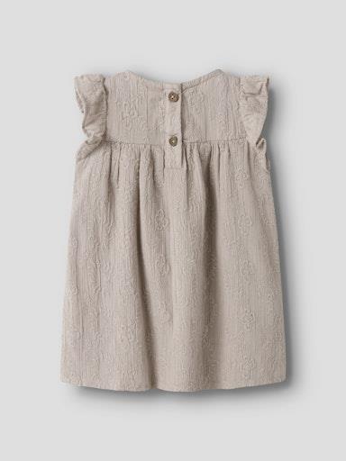 Otroška dekliška modna obleka z all over izvezenim vzorcem, iz prijetnega ekološkega bombaža, z rahlo nabranim spodnjim delom, z volančki na rokavih, zapenjajnje z gumbi zadaj, regular kroj, kratek rokav. Material: 100% ekološki bombaž