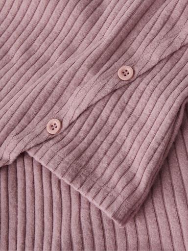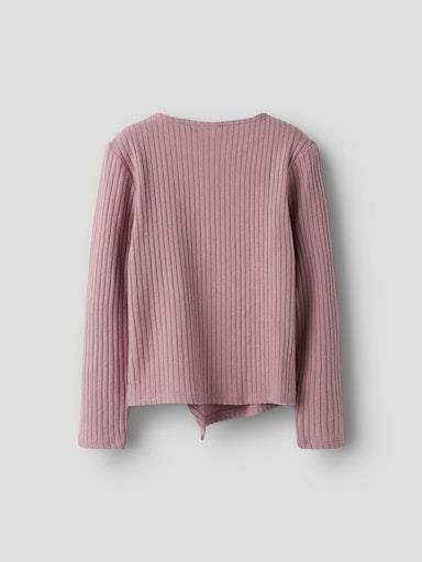 Otroška dekliška modna majica iz prijetnega mehkega rebrastega materiala, asimetrično rezana spodaj, z dekorativnimi gumbi, slim kroj, dolg rokav. Material: 62% poliester, 33% viskoza, 5% elastan