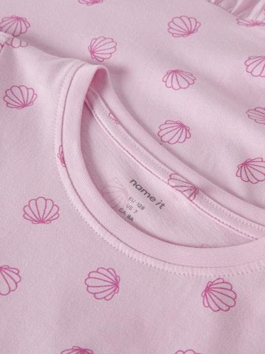 Otroška dekliška prikupna obleka z all over vzorcem, rahlo spuščen pas, z elastiko v pasu in rahlo nabranim spodnjim delom, kratek rokav. Material: 100% bombaž