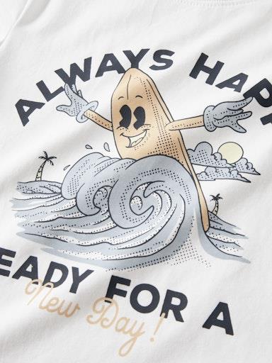 Otroška fantovska mehka in udobna majica z dekorativnim potiskom, regular kroj, z zavihki na rokavih, kratek rokav. Material: 95% ekološki bombaž, 5% elastan