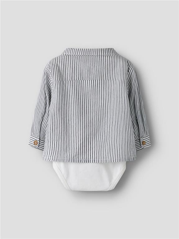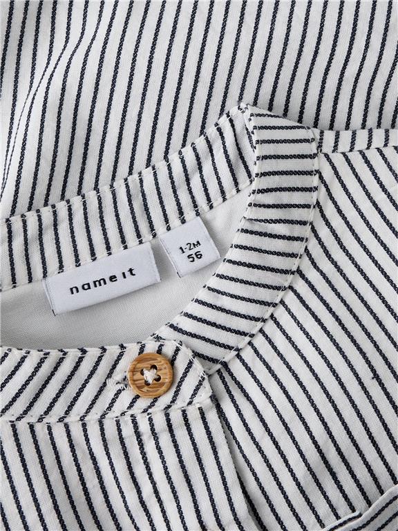 Otroška fantovska elegantna srajca z integriranim body-jem, z ruskim ovratnikom, zapenjanje na gumbe spredaj, z all over črtastim vzorcem, z žepkom v višini prsi, dolg rokav. Material: 100% ekološki bombaž