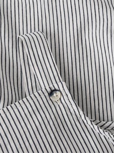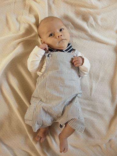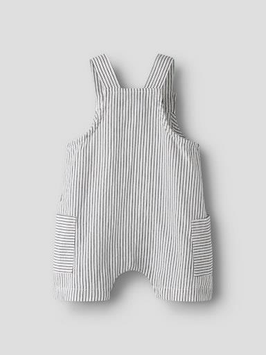 Otroški fantovski pajac iz prijetnega in udobnega materiala, z nastavljivimi naramnicami, ki se zapenejo z gumbom spredaj, z all over črtastim vzorcem, z dvema žepoma na straneh, z neti v razkoraku, za lažje slačenje in oblačenje, kratke hlače. Material: 100% ekološki bombaž