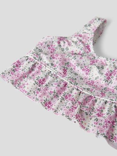 Otroške dekliške modne bikini kopalke, z all over cvetličnim vzorcem na zgornjem in spodnjem delu, zgornji del s širokimi naramnicami in volančki na spodnjem robu, klasičen slim spodnji del, z elastiko in volančki v pasu. Material: 84% recikliran poliester, 16% elastan