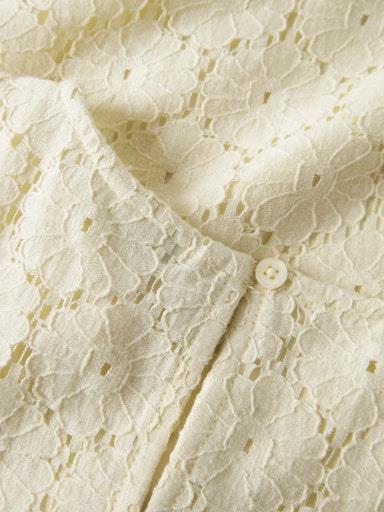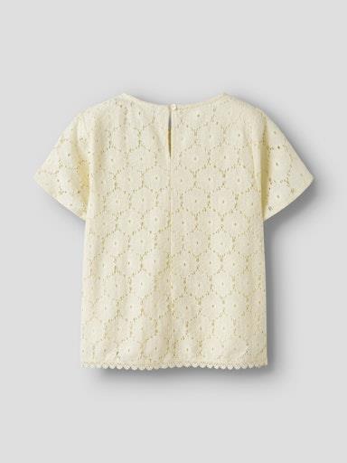 Otroška dekliška modna bluza, z all over izvezenim vzorcem in luknjičastimi detajli, z mehko podlogo, z valovitimi zaključkom spodaj, zapenjanje z gumbom zadaj, regular kroj, kratek rokav. Material: zgornji del: 70% bombaž, 30% najlon; podloga: 100% poliester